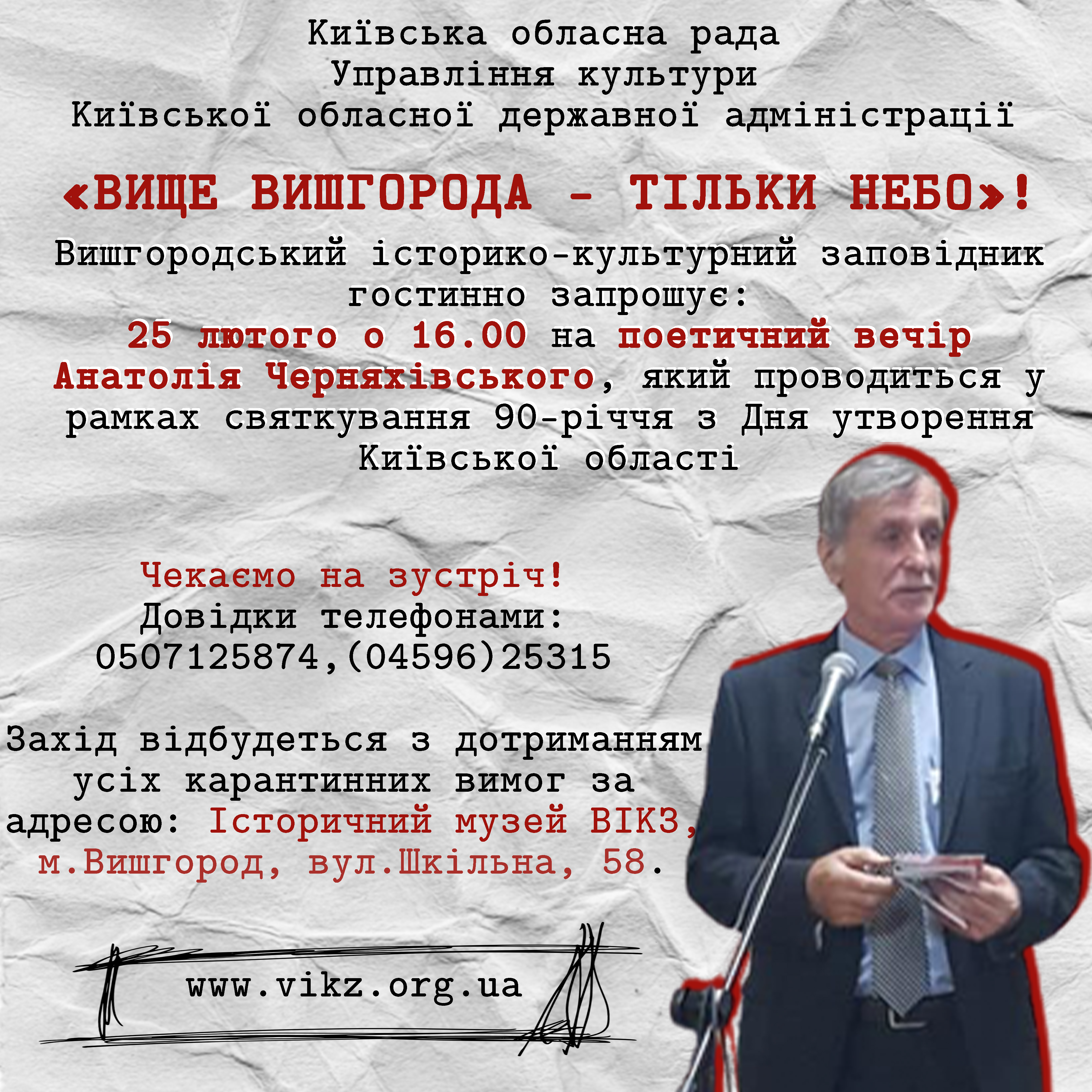 25 лютого 2022 року(п’ятниця) о 16.00 відбудеться творчий вечір відомого поета Анатолія Черняхівського. Цей захід присвячено 90-річчю утворення Київської області.